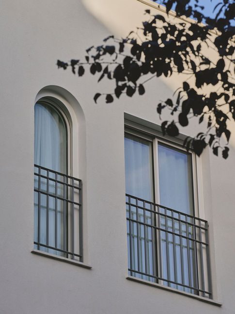 La fachada del edificio adopta una clara estética mediterránea, inspirada en las casas costeras de Sitges: líneas blancas, sobrias y luminosas que transmiten frescura y sencillez.